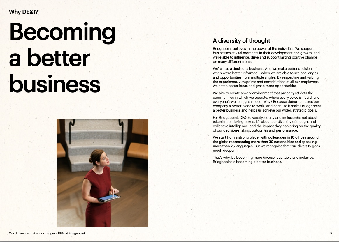 Writing for print and video publications reporting on the strides being made by this international private assets investor in the areas of DE&I (diversity, equity and inclusion) and ESG (environmental, social and corporate governance).